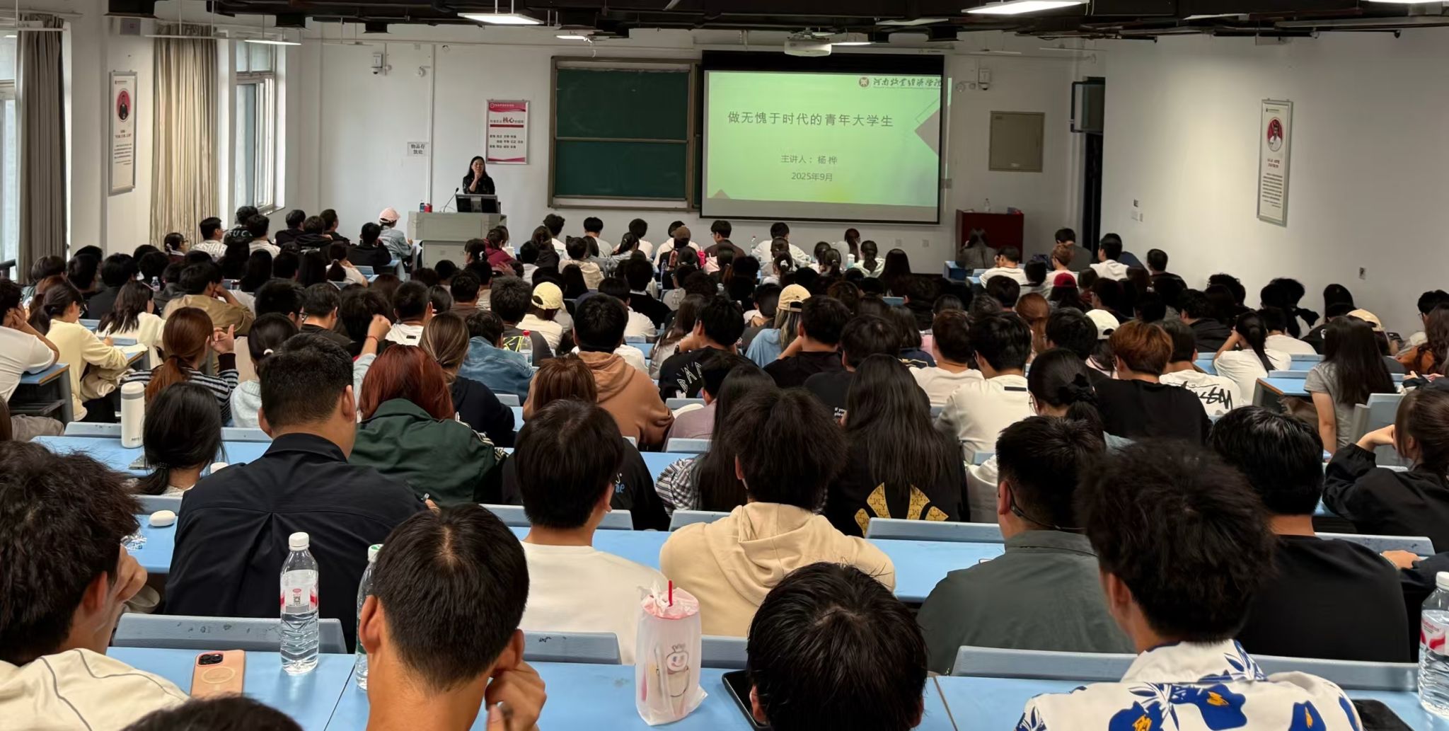 思政课上,杨桦结合毛泽东等老一辈无产阶级革命家的成长故事和王兴兴、梁文锋等时代案例,用生动的语言拉近与新生的距离。杨桦指出,“爱国”不是抽象的口号,而是具体的行动,既要在课堂上深耕专业知识,为未来服务社会、报效国家打下坚实基础,也要主动关注时政热点,增强民族自豪感与责任感,让家国情怀在日常学习生活中落地生根;本科四年是涵养品格、塑造自我的关键期,“修身”就是既要守好学业底线,做到勤学善思、求真务实,也要注重品德修养,学会尊重他人、体谅包容,更要培养坚韧心态,在面对挫折与挑战时不气馁、不退缩,以良好的精神风貌走好成长每一步;关于“担当”,杨桦结合青年学子的时代使命,引导新生明白“担当始于足下”,无论是主动参与班级建设、积极投身志愿服务,还是认真完成每一次作业和任务,她都希望新生们在实践中学会扛起责任,成长为有温度、有担当的新时代青年;谈到“创新”,她指出要敢于打破思维局限,敢于探索未知,珍惜实验室、课堂讨论、社团活动等机会,多问“为什么”、多试“新方法”,用新思路、新行动解锁更多可能;说到“协作”,杨桦强调“独木难成林”,未来无论是学业研究还是职场发展,都离不开团队协作,本科阶段正是培养协作能力的最佳时机,希望新生在小组作业、集体活动中学会倾听、善于配合,在互帮互助中共同进步,凝聚起实现梦想的强大合力。