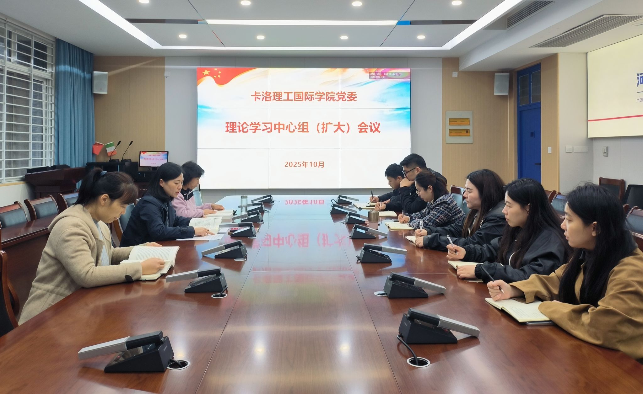 10月10日下午,卡洛理工国际学院召开党委理论学习中心组(扩大)会议,专题学习研讨《习近平谈治国理政》第五卷。学院领导班子、各党支部书记及教工党员参加会议。会议由学院党委副书记杨桦主持。