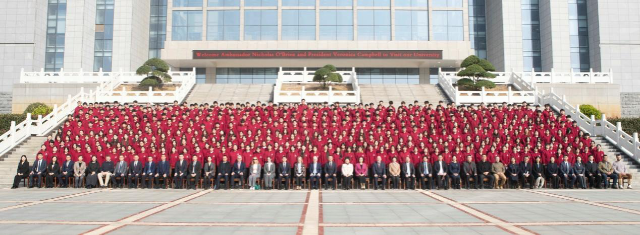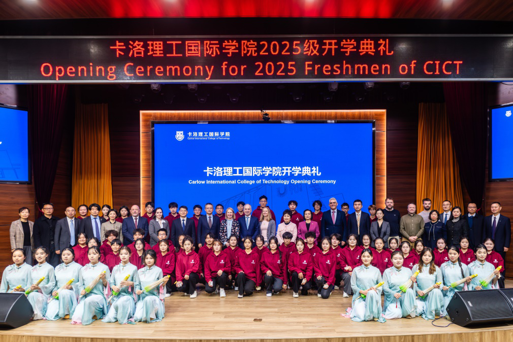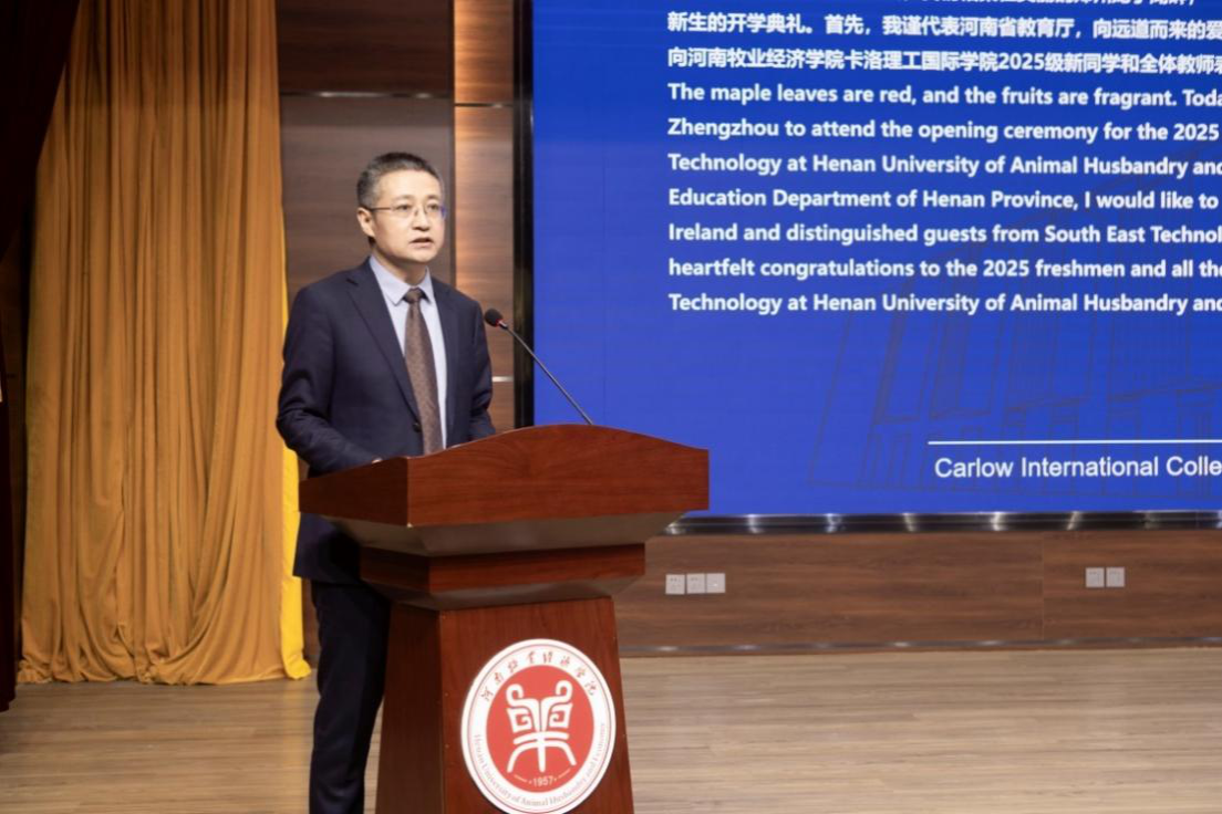 11月5日,爱尔兰驻华大使欧博仁(Nicholas O'Brien)、爱尔兰驻华使馆教育文化参赞万露晞(Lucy Ward),爱尔兰东南理工大学校长维罗妮卡·坎贝尔(Veronica Campbell)、常务副校长大卫·丹尼弗(David Denieffe)、国际部主任唐纳·迈凯利斯特(Donal McAlister)等一行来校访问。河南省教育厅党组成员、副厅长杨光,河南省人民政府外事办公室二级巡视员刘宝,河南省教育厅对外合作与交流处处长王华星,河南省人民政府外事办公室欧洲处三级调研员王剑飞,我校党委书记刘志伟、校长尹新明与到访外宾共同出席了在龙子湖校区报告厅举行的卡洛理工国际学院2025级新生开学典礼。典礼由刘志伟主持。