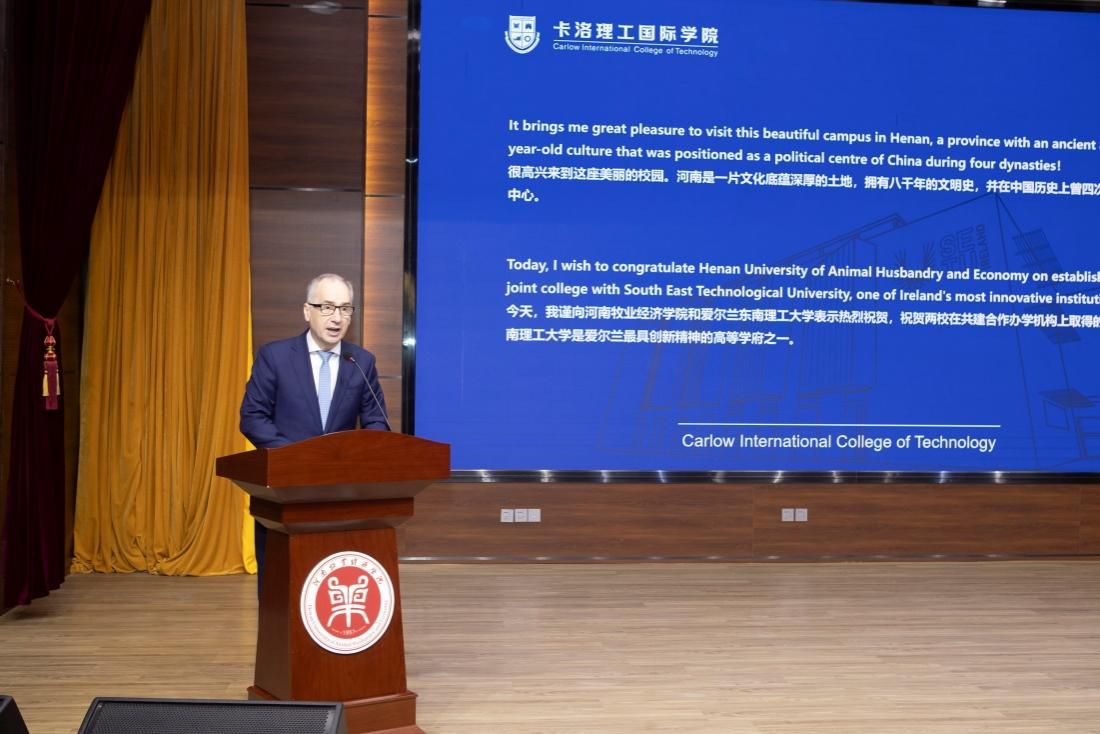 欧博仁大使在致辞中高度肯定了中爱教育合作的深远意义,并对河南牧业经济学院和爱尔兰东南理工大学在共建合作办学机构上取得的成功表示热烈祝贺。他表示,凭借两校的办学实力,通过教学、科研等方面的强强联合,必将在农业科技、食品生产、可持续发展和数字技术等关键领域取得更大更多的成果。他欢迎更多中国学生赴爱尔兰学习,为中爱人文交流、文化互鉴和经贸合作发挥更大作用。