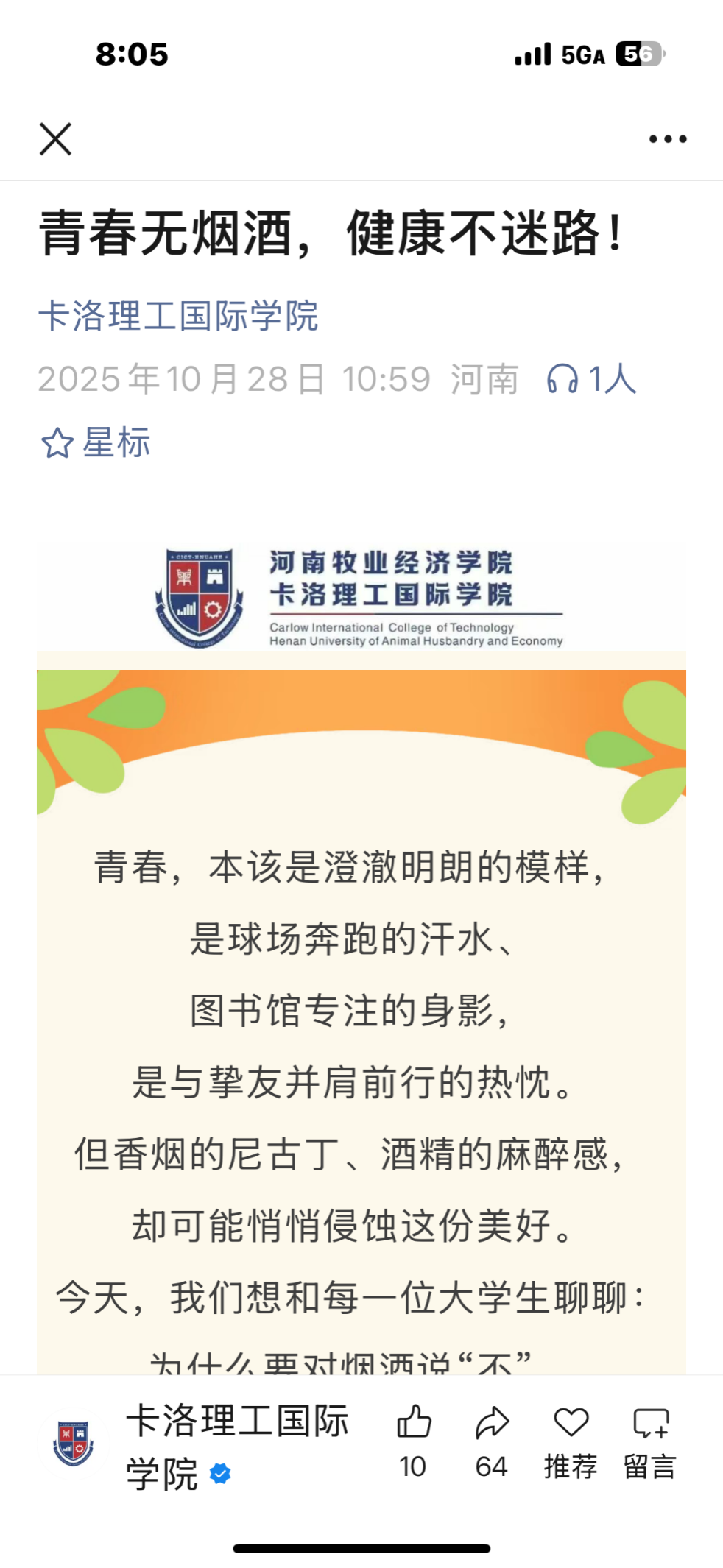 通过班会、公众号推文等,深入宣传教育吸烟饮酒对身心、学业、安全的危害;解读校园管理规定,对吸烟引发消防隐患以及酒后滋事等行为进行教育警示;鼓励学生相互监督,共同维护无烟无酒的清新校园环境。成立由学工队伍、学生骨干、学生志愿者组成的“禁烟巡查督导队”,在全校范围内开展禁烟巡查工作。对校园、宿舍区、教学楼等重点区域进行全区域、全时段、全覆盖巡查,对吸烟行为进行及时、有效地劝导与记录。