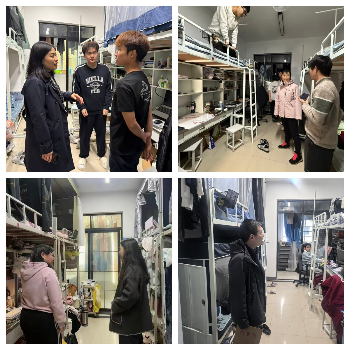建立“日常自查+学院周查+学校月评”的三级宿舍卫生检查机制,充分发挥学工队伍、学生骨干作用,切实加强学生宿舍日常卫生管理,重点督查卫生间、阳台、床下、门窗等卫生死角,检查记录纳入综合素质评价。督促引导学生合理收纳、保持整洁,养成良好卫生行为习惯;选树“党员示范宿舍”“五星宿舍”等典型,发挥朋辈榜样示范引领作用;举办“五星宿舍”图片展,鼓励学生自主装饰宿舍,营造温馨和谐的居住环境。提倡学生们按时作息,倡导每晚11:00前熄灯息声,营造良好睡眠环境。