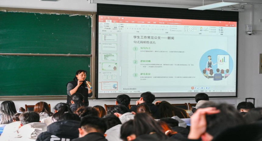 11月18日,党委副书记黄尚丽以《新媒体公文写作方法与技巧》为主题讲授首场课程,从河南牧业经济学院官网的典型案例切入,系统阐述公文写作的核心原则、格式规范与常见误区,并组织现场写作练习。课程内容严谨、实操性强,有效夯实学员的文字基础,为提升学院学生工作宣传质效提供有力支撑。