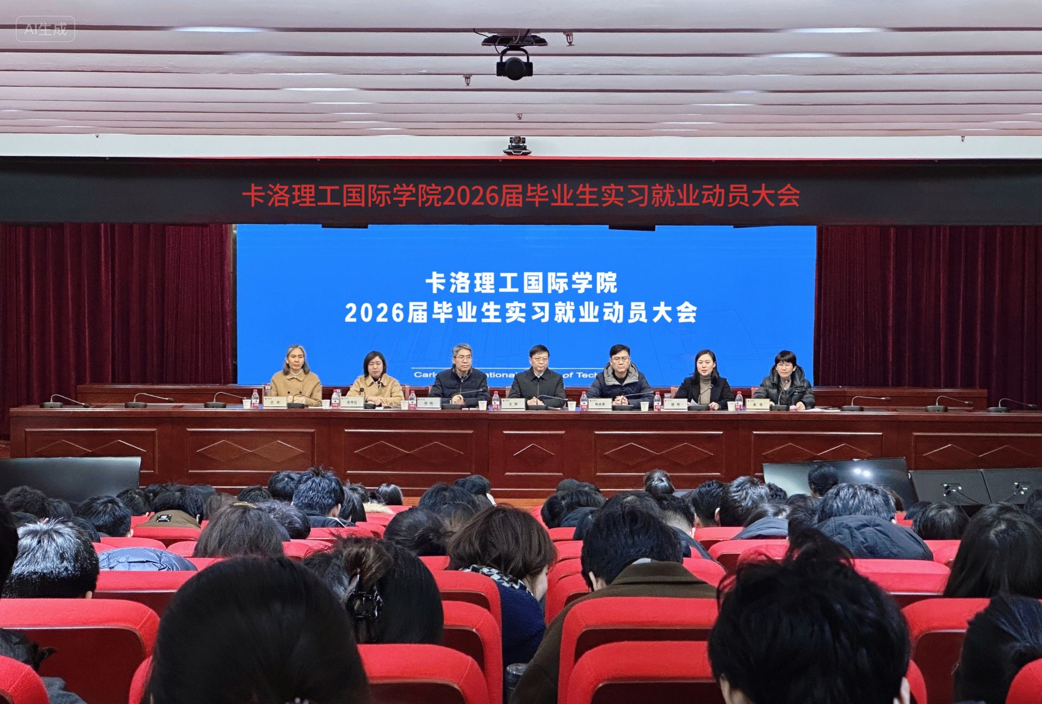 为扎实推进2026届毕业生实习就业工作,帮助学子明晰实习方向、强化责任意识,实现从校园到职场的平稳过渡,12月24日,卡洛理工国际学院在龙子湖校区隆重召开2026届毕业生实习就业动员大会。学院邀请三个母体学院——信息工程学院院长王硕、经济与贸易学院院长韩启昊、生命科学学院院长郑鸣莅临指导,卡洛理工国际学院领导班子、各专业负责人、学院辅导员、班主任及全体2026届毕业生参会,会议由学院党委副书记崔锦主持。