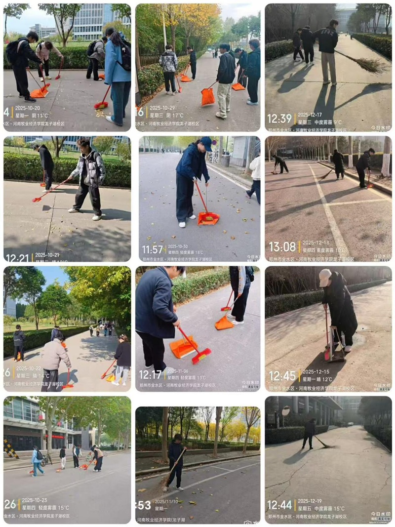 班级轮值践初心,校园焕新显担当。学院精准部署校园清洁劳动实践工作,针对25级7个班级制定详细轮班值日方案,科学划分教学楼公共区域、校园主干道、绿化带等清洁责任区,明确清扫标准、时间节点与安全规范。每天中午,各班级学子在生活委员的带领下,携带清洁工具有序开展劳动:扫地、拖地、擦拭门窗、清理垃圾、规整公共物品,分工协作、有条不紊。从教室角落的细致清扫到校园道路的全面保洁,学子们用双手扮靓校园环境,在亲身实践中体会“一屋不扫,何以扫天下”的深刻内涵,逐步养成崇尚劳动、热爱劳动的良好习惯,责任感与团队协作意识显著提升。