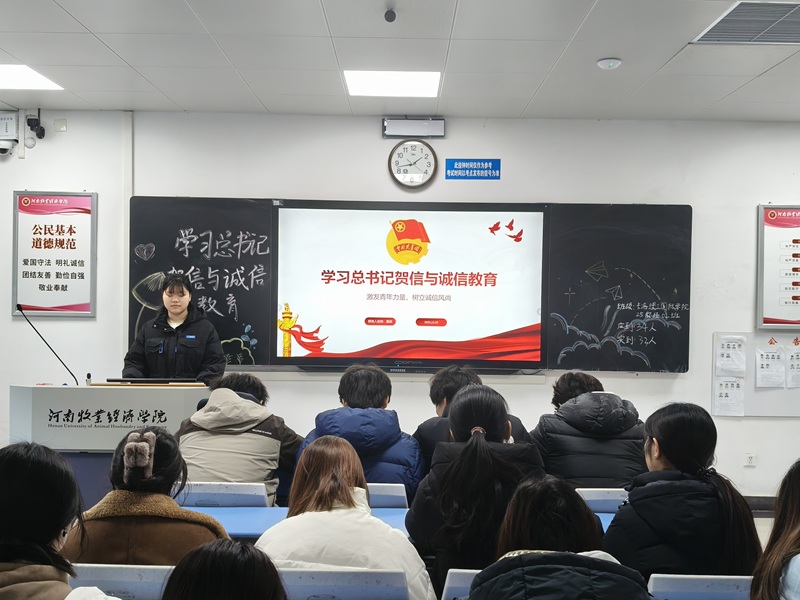 各班团支书围绕“诚信”主题,系统阐释了其在学业、交往与个人发展中的核心价值,并结合学术规范、考试纪律等具体场景,明确诚信底线与行为准则。活动中,王奕萱瑜同学通过PPT展示,生动讲述经典诚信故事与反面警示案例,剖析失信行为对个人与集体的危害;孙翊博、秦立晶等同学分别结合实践倡议“知行合一、诚信应考”,并组织全体同学签署诚信承诺书,以仪式强化责任担当。活动还通过案例剖析、知识问答、情景模拟等形式,深化学生对诚信内涵的理解,推动诚信理念入脑入心。