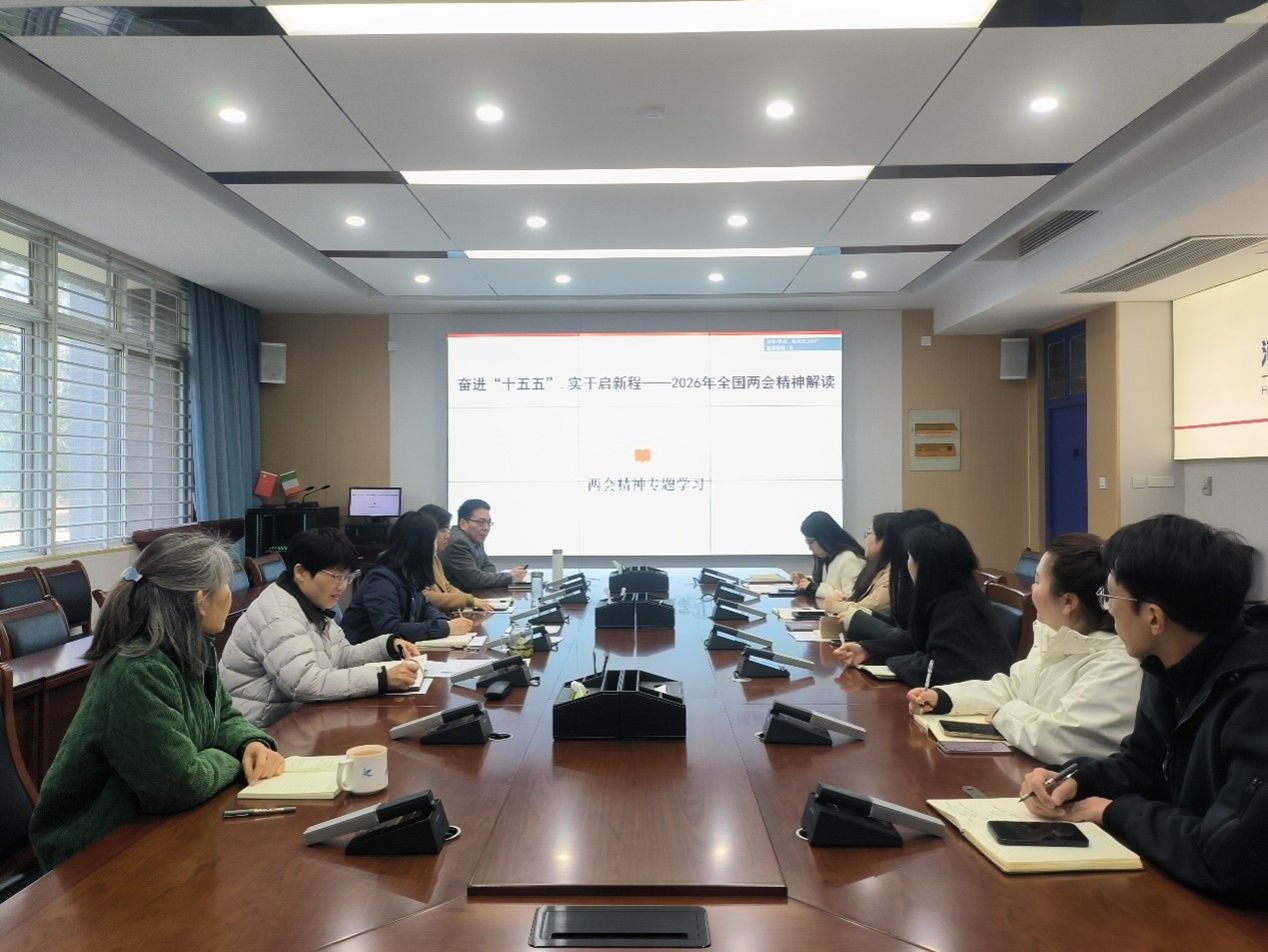 深研细悟,以学促干强本领。3月12日上午,按照学院学习安排,副院长刘明定教授以2026年全国两会的主要内容、政府工作报告新提法、两会主要精神、落实两会精神实践要求为主线,结合国际教育发展、人才培养、科技创新等学院实际,对全国两会精神进行系统解读与深入阐释。刘明定指出,今年全国两会是在“十五五”规划开局起步的关键时期召开的重要会议,为教育事业高质量发展指明方向。全院师生要深刻把握新质生产力、智能经济新形态、教育科技人才一体化等战略部署,将两会精神融入日常教学、科研创新等工作。